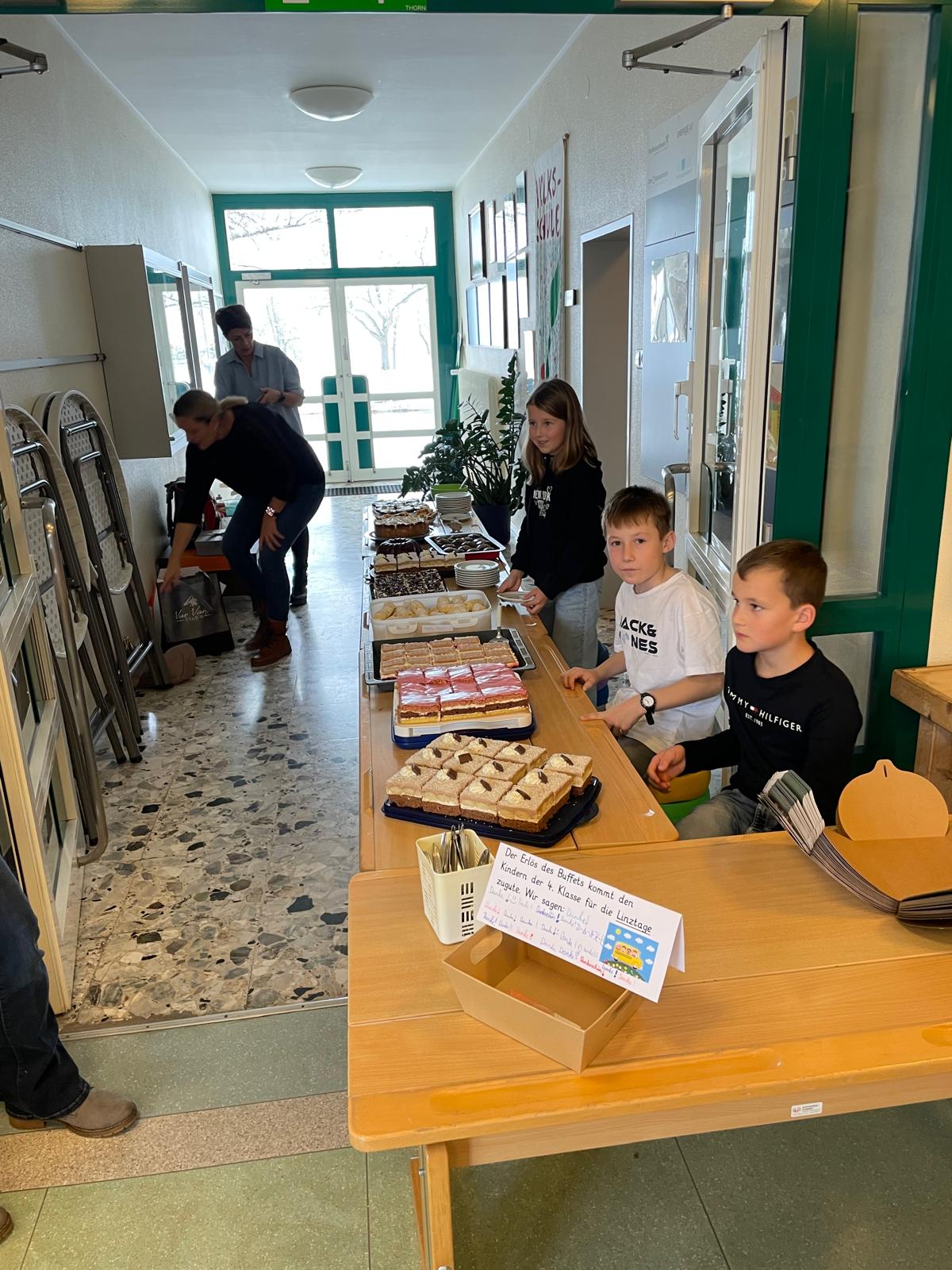 Ein herzliches Dankeschön gilt den Eltern der 4. Klasse, die mit köstlichen Kuchen und selbstgemachten Aufstrichen für ein exquisites Buffet gesorgt haben. Der Erlös kommt der 4. Klasse zugute und wird für die geplante Linzfahrt verwendet.